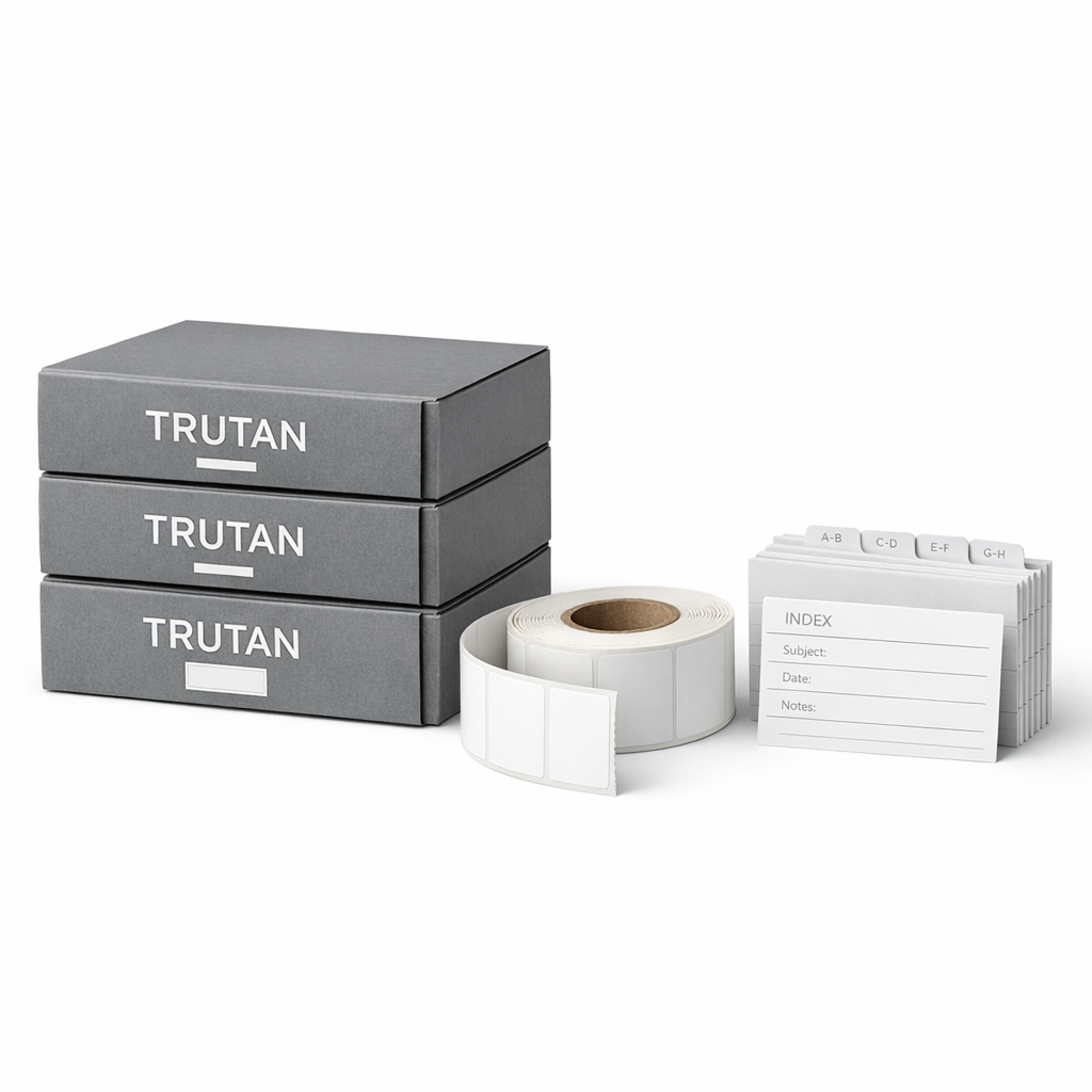 Archive projects, tax records or client files with the TRUTAN Filing & Archive Set. Three reinforced matte grey document boxes stack cleanly on shelves, supported by minimalist label rolls and indexed classification cards so you can find what you need years from now.
